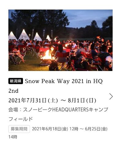 Snow Peak のキャンプイベント Snow Peak Way 2021in HQ2ndが今月下旬に開催されます。 先月抽選の結果、無事当選しました! Snow Peak WayはSnow Peakのキャンプのイベントです。 ワークショップがあったり紙ひこうきを飛ばす大会があったり、スタッフの皆…
